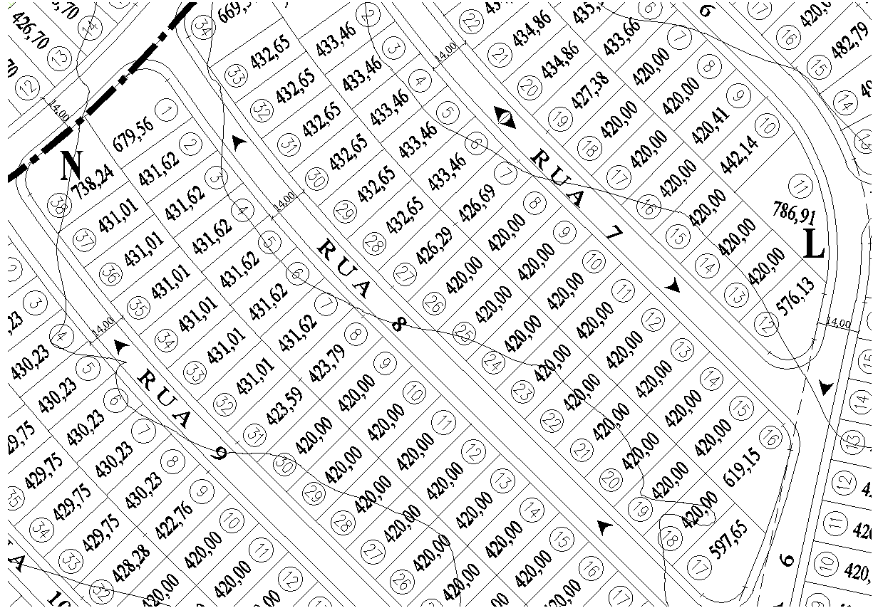 Elaboração da planta com medidas de lotes, áreas, número de lotes, comprimento e área de ruas, numeração, medidas e áreas dos sistemas de lazer e áreas verdes; Linhas de eixo e estaqueamento das ruas; Eventuais anotações em projeto, atendendo exigências do município.